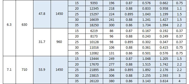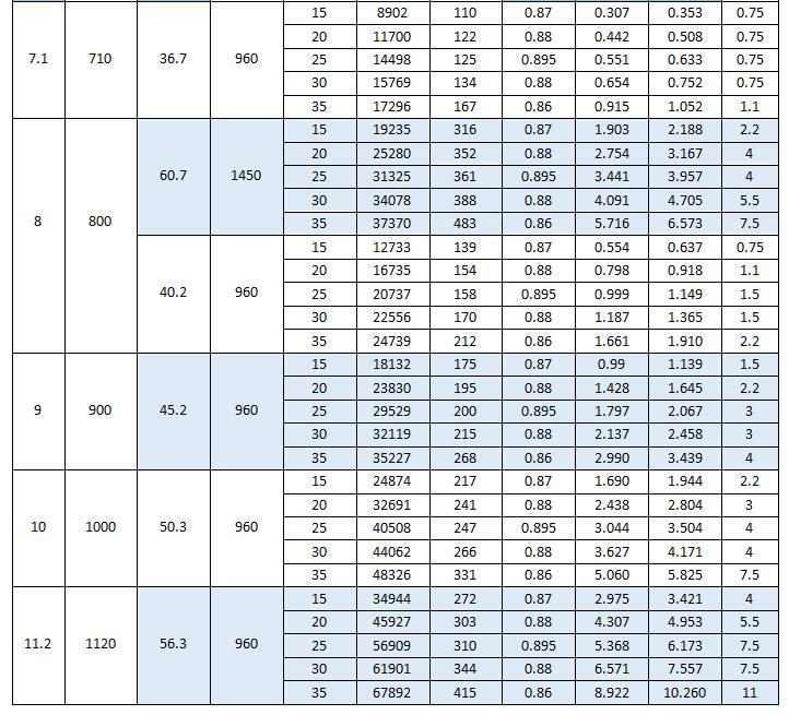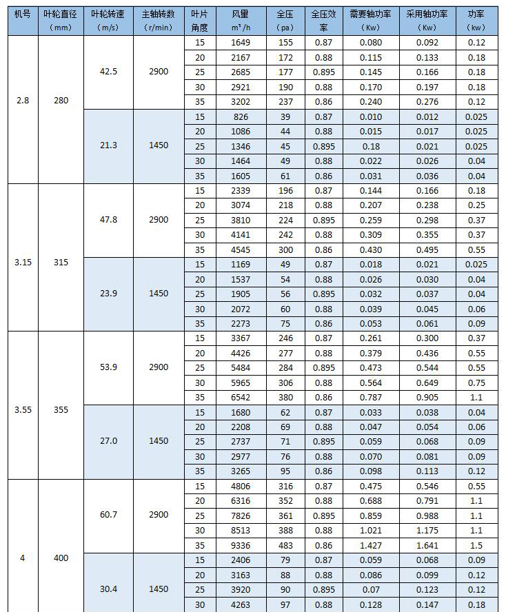 T35型軸流通風(fēng)機按葉輪直徑共分為13個機號,依次排列為NO2.8、3.15、3.55、4、4.5、5、5.6、6.3、7.1、8、9、10、11.2。每一個機號又分為15°、20°、25°、30°、35°等5種葉片安裝角度。