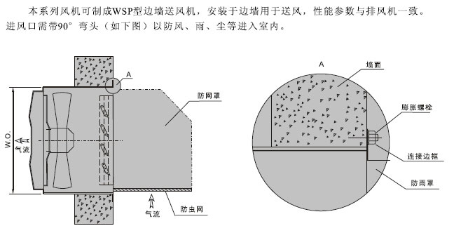 DWEX邊墻風機采用前掠型葉片、低噪音的外轉(zhuǎn)子或內(nèi)轉(zhuǎn)子風機用電機真聯(lián)傳動,方形外殼設(shè)計可以方便地安裝在混凝土墻、磚墻或輕鋼壓型墻板上,方形防雨罩結(jié)構(gòu)牢固,外形美觀。具有噪聲低、風量大、運行可靠、性能參數(shù)范圍廣、安裝簡便等特點,廣泛應用于工礦企業(yè)車間和發(fā)用、商用建筑工程的邊墻壁式通風換氣。根據(jù)輸送介質(zhì)的要求,可制成防腐、防爆型.DWEX(WEX)邊墻風機一般用于邊墻壁式排風,配設(shè)45°防雨罩(或特殊制造成60°)和防蟲網(wǎng)(夜間可防止昆蟲循燈光飛入車間)??砂葱枰瞥蛇厜λ惋L型號為DWSP(WSP),配設(shè)90°防雨罩(防風、雨、塵)和防蟲網(wǎng)(夜間可防止昆蟲循燈光飛入車間)。附件選配:重力式止回風閥(可確保車間在風機不開時保持室外隔絕),訂貨時注明。
